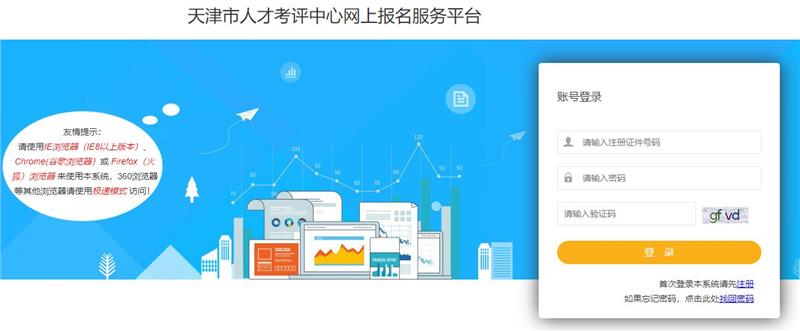 考试采取网络报名方式,请报考人员登录"天津市人才考评中心网上报名服务平台"(网址为http://47.99.242.51/tip/stdlogin.do?method=fwdLoginPage)进行报名。报考人员须在规定时间内完成报名,逾期无法进行报名。