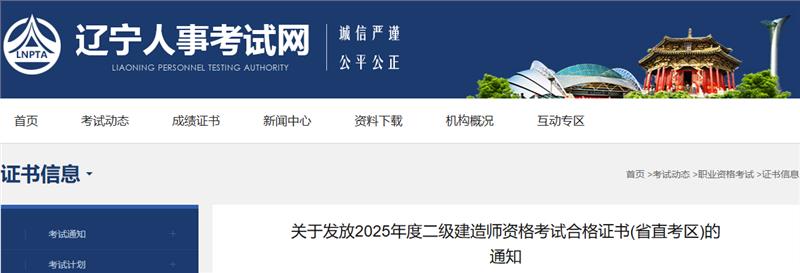 辽宁人事考试网于近日发布《关于发放2025年度二级建造师资格考试合格证书(省直考区)的通知》,2025年辽宁二级建造师证书省直考区于2025年10月13日起办理证书邮寄,2025年10月30日可到现场领取。