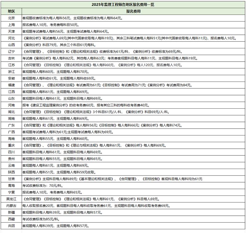 国家监理工程师报名费由各省自主规定,每科费用一般在50-100元之间,具体标准各省不同。缴费通过中国人事考试网进行,逾期未缴视为报名无效,缴费后不予退还。考生可暂时参考2025年全国各省监理工程师收费标准。