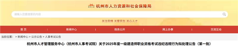 从杭州市人力资源和社会保障局获悉,杭州市2025年一级建造师考试违纪违规行为拟处理公告(第一批)已发布,涉及24人,详情如下。根据《专业技术人员资格考试违纪违规行为处理规定》(人力资源和社会保障部令第31号)第十七条规定,现将2025年度一级建造师职业资格考试中已认定的部分违纪违规考生的考试违纪违规行为事实及拟处理意见公告如下。考生如对所认定的违纪违规事实及拟处理意见存在异议,可在公告之日起5个工作日内提出陈述和申辩。逾期未提出陈述申辩的,将依法依规作出正式处理决定。