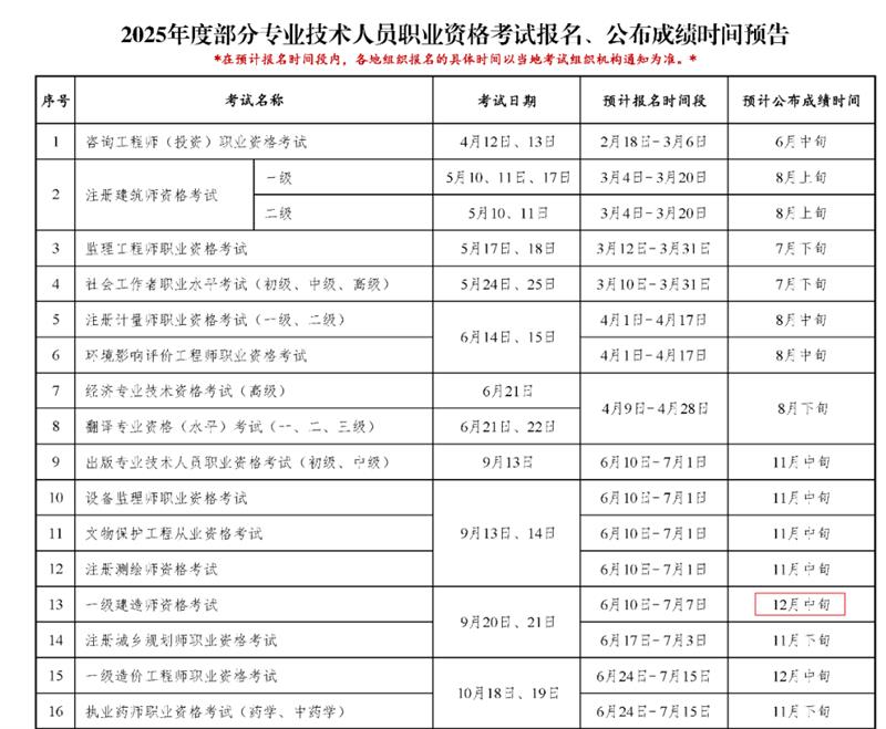 中国人事考试网发布的《2025年度专业技术人员职业资格考试重要事项提示》里也提到,一级建造师考试成绩将在12月中旬公布。